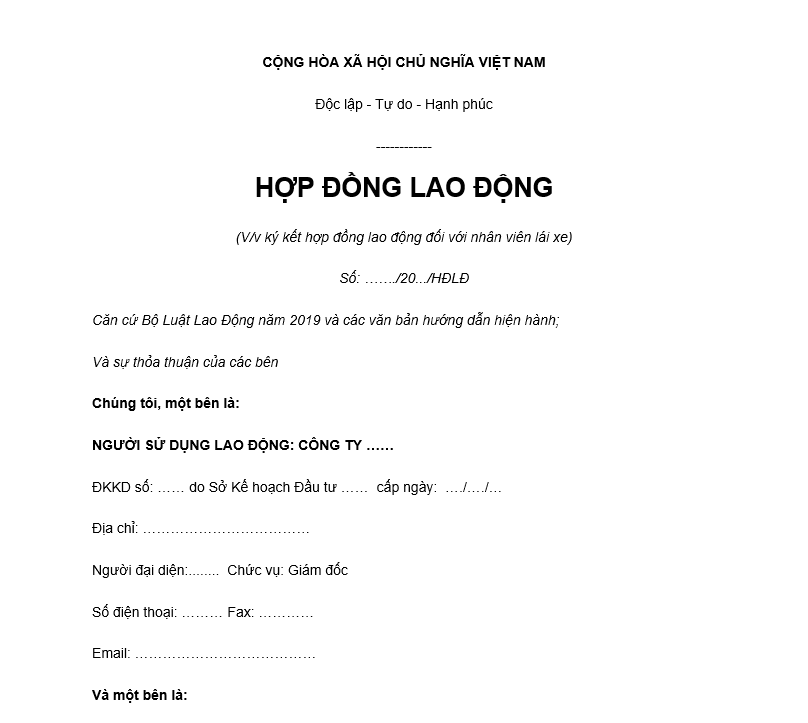 Mẫu hợp đồng lao động lái xe.